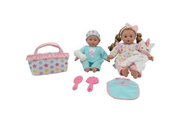Kisses n Cuddles 12 and 16 inches sibling baby set includes two beautifully crafted dolls, each accompanied by a number of accessories for immersive play, plus a charming animal buddy for extra fun. The dolls’ outfits can be taken off and put back on, allowing kids to change their wardrobes. Suitable for ages 2 and up.
