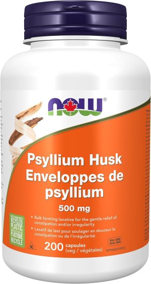 NOW Supplements, Psyllium Husk Caps 500 mg, Natural Soluble Fibre, Intestinal Health*, 200 Veg Capsules