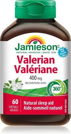 Jamieson Valerian 400 mg, Calming, Melatonin-Free, Natural Herbal-Based Sleep Aid, Reduces Nervousness and Restlessness. Gluten-Free, 60 Softgels, Proudly Canadian
