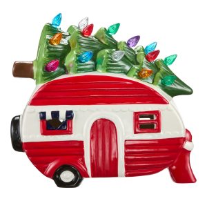 FOR LIVING Pre-Lit Ceramic Christmas Village Camper with Christmas Tree Tabletop Décor, 8-in