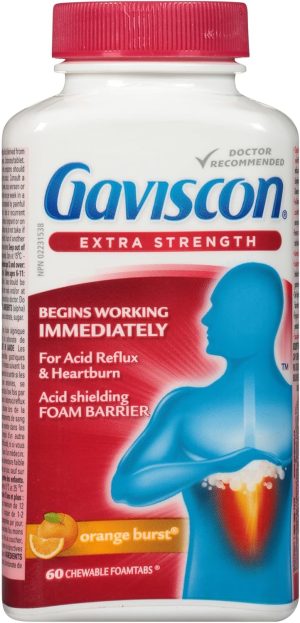Gaviscon Extra Strength Tablets – 60 Count – Chewable Foaming Antacid Tablets for Day and Night Heartburn Relief, Acid Reflux and GERD Relief, Orange Burst – Free of Aluminum, Lactose and Gluten