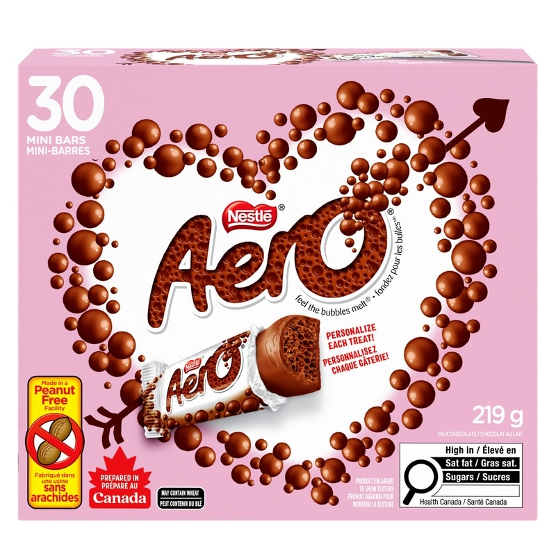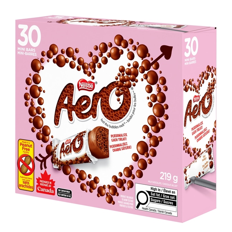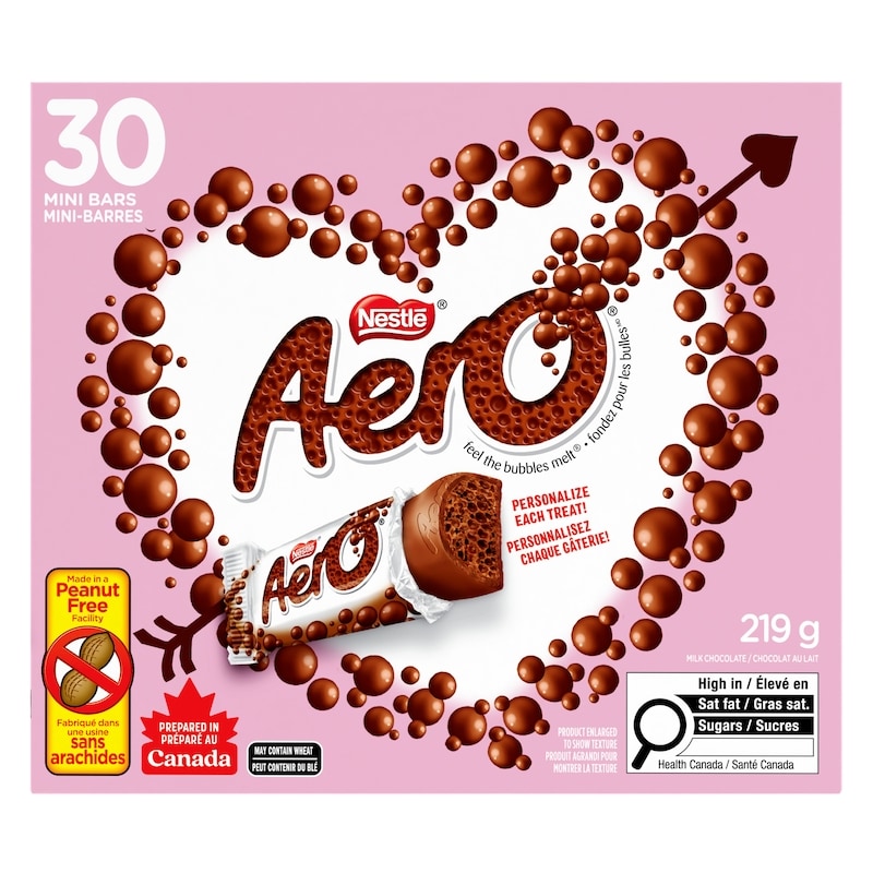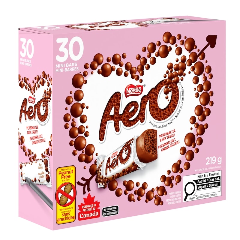 Celebrate Valentine’s Day with NESTLÉ AERO Valentine Mini Bars! These festive mini chocolate bars are melt-in-your-mouth bites of real milk chocolate filled with tiny bubbles. Each mini bar includes a space to write a message, making them perfect Valentine treats for family, friends, classmates, or someone special. Made with natural flavours, AERO Valentine Mini Bars are proudly prepared in a Canadian peanut-free facility. NESTLÉ is committed to making a positive impact. The NESTLÉ Cocoa Plan, in collaboration with the Rainforest Alliance, is helping cocoa farmers enhance farming practices. AERO’s smooth and creamy texture, combined with the lightness of the classic bubbles you know and love, make celebrating Valentine’s Day even sweeter. Feel the bubbles melt with AERO Valentine Mini Bars!