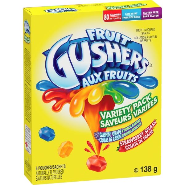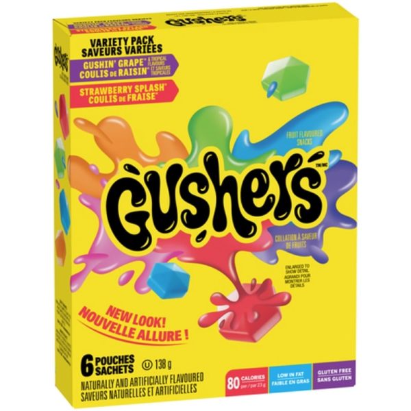 Gushers Fruit Flavoured Snacks are bursting with fun. Gushers have a juicy center that bursts open with delicious fruity flavoured liquid. Enjoy delicious Gushers Variety Pack, featuring Strawberry Splash and Gushin’ Grape flavours. With wild flavours and colours, the possibilities for fun are endless. You’ve finally found the perfect after-school snack that’s a win for you and your kids. Packaged for on-the-go convenience, Gushers Fruit Flavoured Snack pouches are the perfect addition to your pantry and grocery routine and a snack every member of the family will love. These tasty treats are Gluten Free and Gelatin Free. Variety Pack contains six fruit flavoured snack pouches in total.