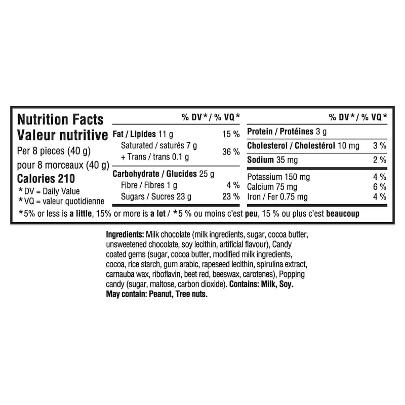 Have a popping good time anywhere you go! CADBURY DAIRY MILK Fireworks chocolate bar combines the smooth goodness of CADBURY DAIRY MILK milk chocolate with candy-coated gems and popping candy. This tasty bar is big on fun with the crackle of popping candy in every bite. Combined with CADBURY DAIRY MILK milk chocolate, CADBURY DAIRY MILK Fireworks is a fun adventure for your taste buds and the perfect portion size when you’re needing me-time, or looking to unwind from a busy day.