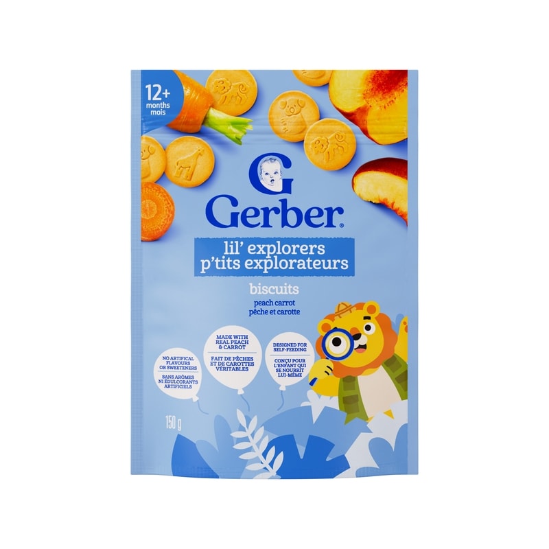Let’s snack and play with GERBER Lil’ Explorers! Introduce your little one to a world of fun and flavour with GERBER Lil’ Explorers Peach Carrot biscuits. Specially crafted for babies and toddlers 12 months and up, these delightful snacks feature playful animal shapes designed to spark your baby’s imagination while satisfying their growing taste buds with a yummy fruity flavour.Made with real peach and carrot and absolutely no artificial colours, flavours, or sweeteners, Gerber Lil’ Explorers cookies offer a wholesome snacking option you can feel good about. Plus, their easy-to-grasp design encourages independent self-feeding — a perfect way for your little adventurer to build confidence during snack time.Whether you’re at home or on the move, these biscuits are perfect for on-the-go snacking. Just toss a pack in your bag, and you’re ready for any outing!Important: This product should only be fed to seated, supervised children who are accustomed to solid foods.Let your child snack, play, and explore — one tasty bite at a time with GERBER Lil’ Explorers Peach Carrot biscuits!