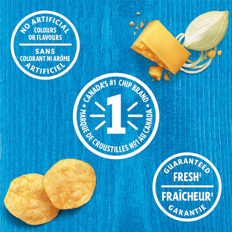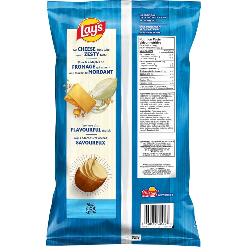 All you need is one bite of Lay’s Cheese & Onion flavoured potato chips, and you’ll see why cheese fans love this satisfying match! Keep a bag in the pantry when you want a zesty, savoury snack break. It all starts with real potatoes that are carefully washed, peeled, sliced and cooked, so you get that perfect, crispy chip every time. Share with friends and family at your next game day watch party, movie night, backyard barbecue, road trip, and more. These potato chips are guaranteed fresh, contain no artificial flavours or colours, and have zero trans fat. They’re also certified Kosher. Made in Canada from domestic and imported ingredients.