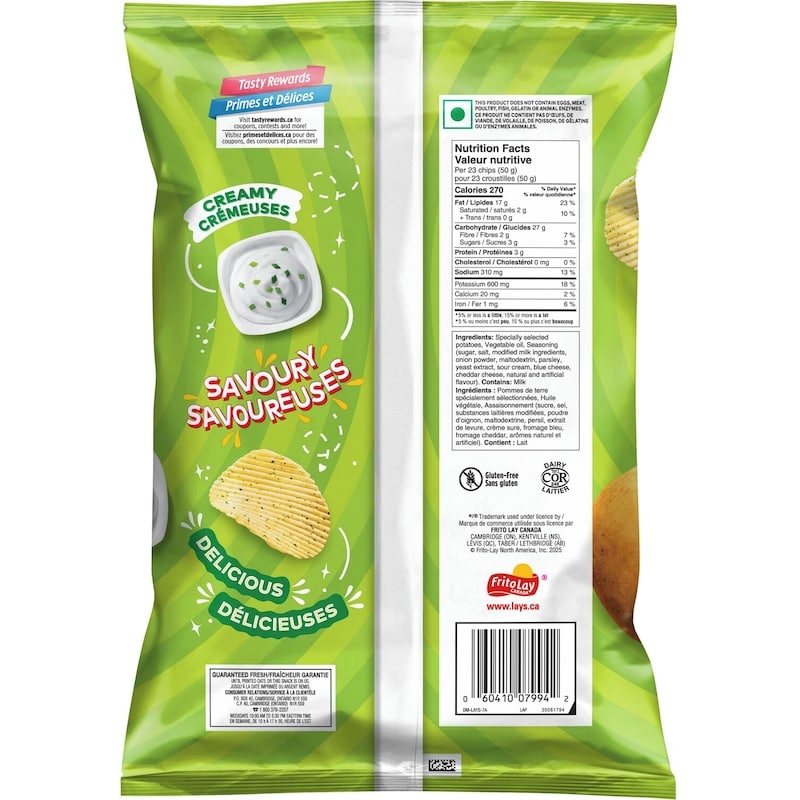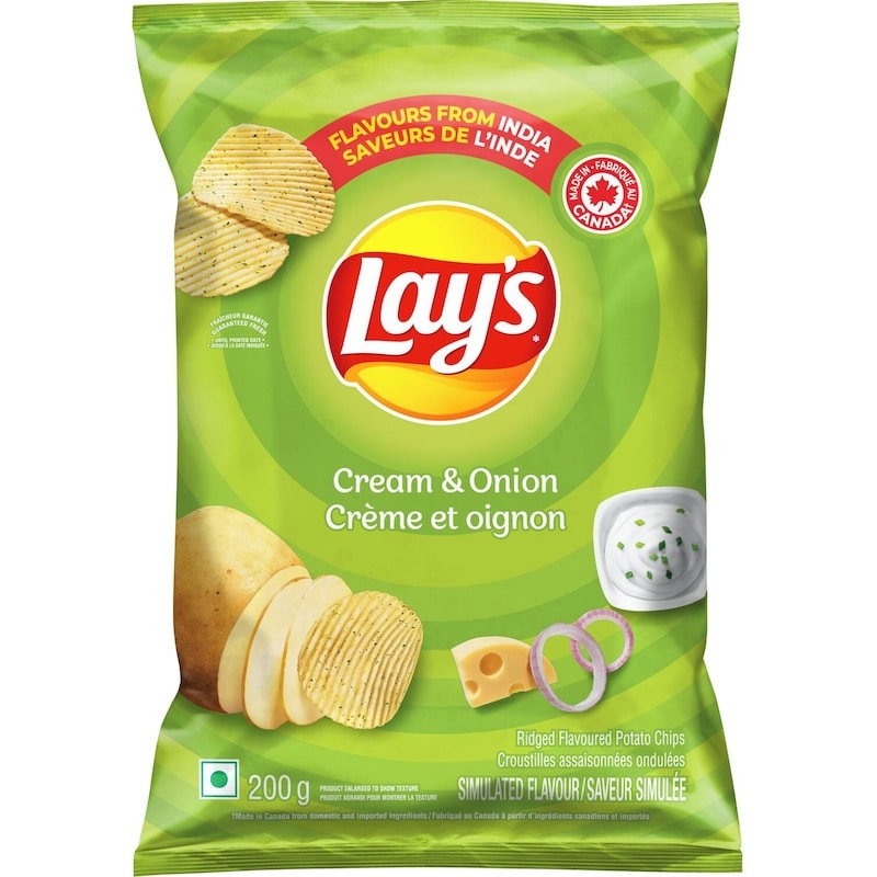 Lay’s Cream & Onion ridged flavoured potato chips – creamy, savoury and delicious ridged potato chips! Inspired by Lay’s India’s most popular flavours, we’ve created a Cream & Onion flavour of our very own for you to enjoy. Always Fun, Always Yum!Snack time just isn’t complete without the timeless taste of Lay’s potato chips! With many flavours to choose from, Canadians have been enjoying Lay’s products for many years. It all starts with quality potatoes.Lay’s potato chips are made with quality potatoes. Simple, wholesome and real. After carefully washing, peeling and slicing the potatoes, we cook them until they are perfectly crispy, creating the wonderful potato chips that Canadians know and love.Whichever flavour you choose, you can always count on our delicious potatoes, so you get that perfect, crispy chip every time you reach for Lay’s. Lay’s Cream & Onion ridged flavoured potato chips are no exception!