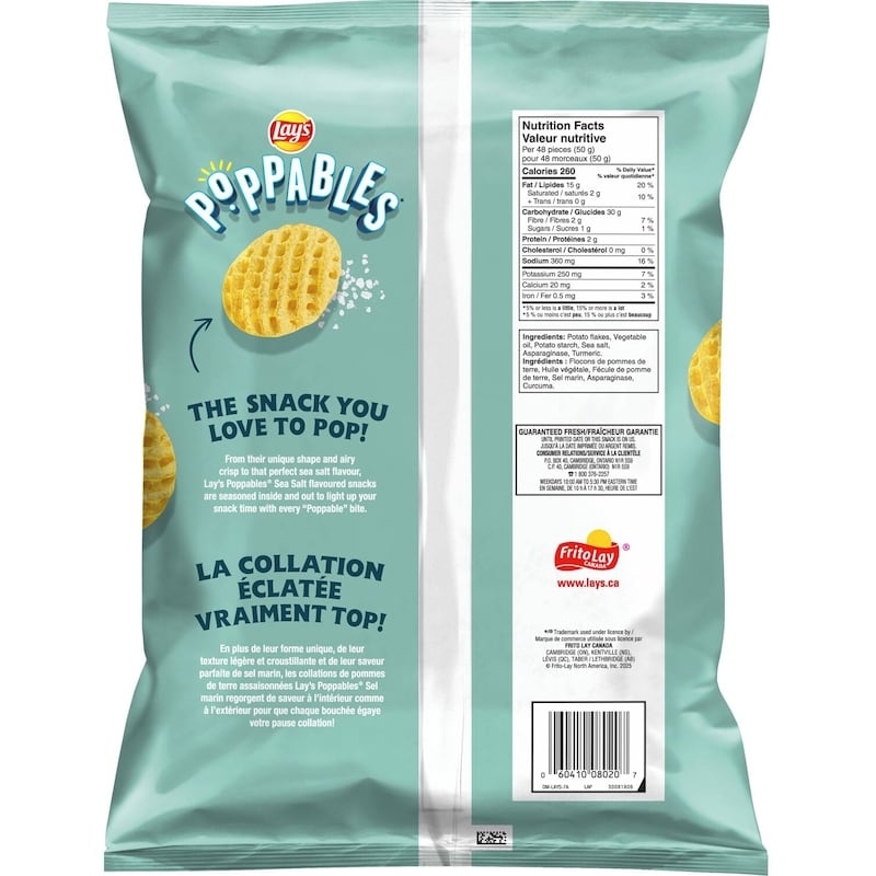 - There’s something about the light texture & airy, crispy crunch of Lay’s Poppables Sea Salt flavoured potato snacks that makes you go, “Mmmm.” It could be the bite-sized, perfectly popped shape. Or maybe that they’re deliciously seasoned with sea salt, both inside & out. Either way, we think you’ll find these one-of-a-kind potato snacks perfect to pop any time of day.