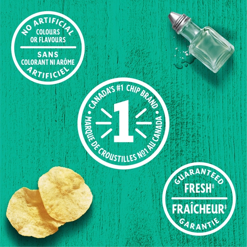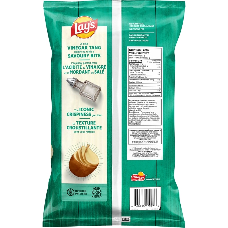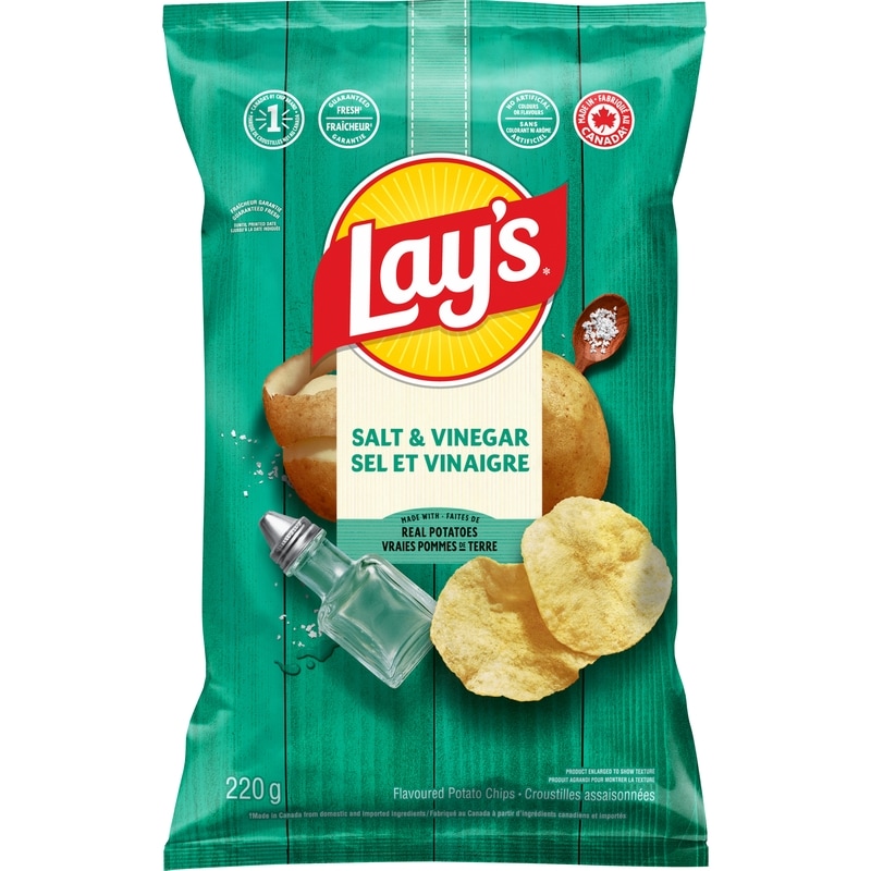 Take a taste adventure with the bold bite of Lay’s Salt & Vinegar flavoured potato chips. Seasoned with the robust flavour of tangy salt and vinegar, these chips have a crispy texture and a classic taste that pairs well with any meal. Savour the tangy flavour that’s sure to get your taste buds hopping. A chip-lover’s favourite, this outstanding flavour is served up with the crispy and fresh taste of Lay’s!Snack time just isn’t complete without the timeless taste of Lay’s potato chips! With many flavours to choose from, Canadians have been enjoying Lay’s products for many years.Lay’s potato chips are made with quality potatoes. Simple, wholesome and real. After carefully washing, peeling and slicing the potatoes, we cook them until they are perfectly crispy, creating the wonderful potato chips that Canadians know and love.Gluten-Free.
