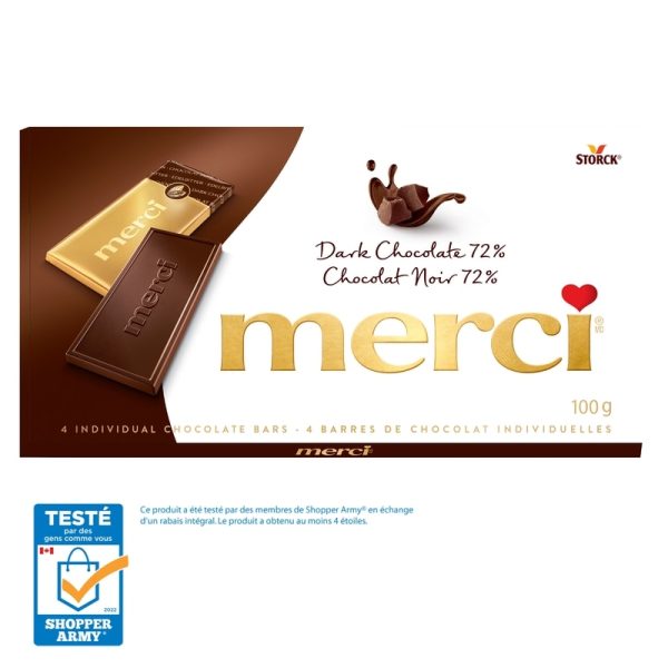 For the chocolate lovers, indulge yourself with merci® chocolates. Discover the deep, intense flavors of merci® 100g Dark 72% chocolate bar. Made with high-quality ingredients, merci® chocolate bars provide an incomparable, delicately melting European chocolate experience, offering a moment of pure indulgence and satisfaction with every bite. Each bar includes 4 individually wrapped pieces, perfect for sharing with someone special. merci®, for you!