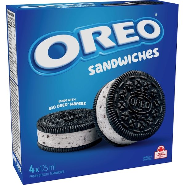 Calling all OREO fans! OREO cookies have been transformed into an irresistible frozen treat. OREO creme-flavoured frozen dessert is mixed with lots of real OREO cookies and sandwiched between two big OREO cookie wafers for the ultimate OREO experience. Dessert perfection! OREO frozen dessert sandwiches are individually wrapped so you can easily enjoy them alone or share with family and friends. Proudly made in Canada, this yummy frozen dessert has no artificial colours. Keep frozen.