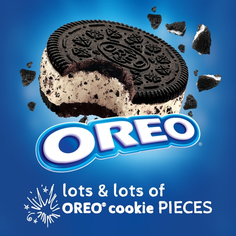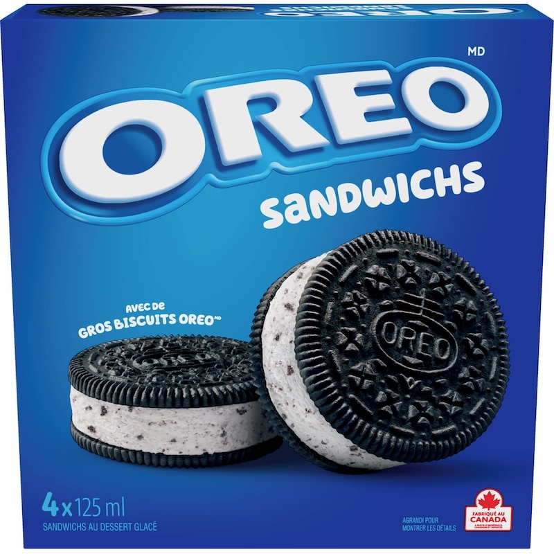Calling all OREO fans! OREO cookies have been transformed into an irresistible frozen treat. OREO creme-flavoured frozen dessert is mixed with lots of real OREO cookies and sandwiched between two big OREO cookie wafers for the ultimate OREO experience. Dessert perfection! OREO frozen dessert sandwiches are individually wrapped so you can easily enjoy them alone or share with family and friends. Proudly made in Canada, this yummy frozen dessert has no artificial colours. Keep frozen.