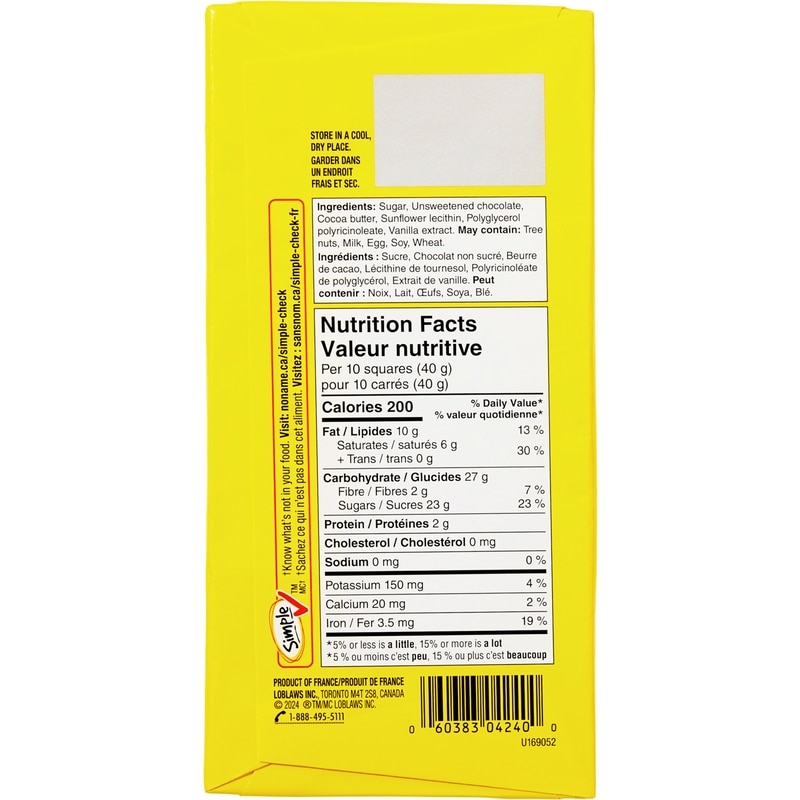 Enjoy a yummy treat after dinner with Dark Chocolate Bar. A product of France, this dark chocolate bar contains 40% cocoa solids for a mouth-watering taste.