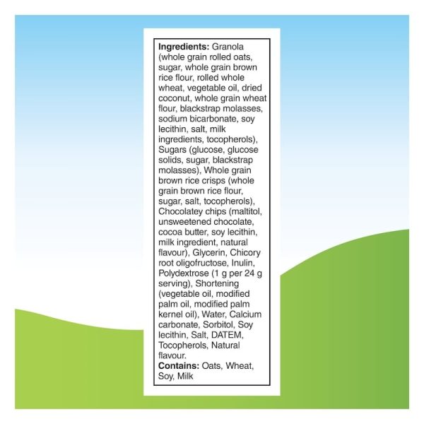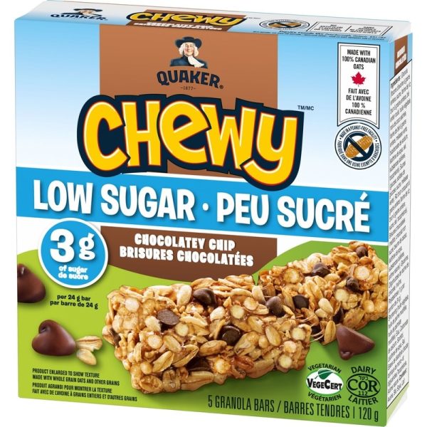 - Quaker Chewy Low Sugar Chocolatey Chip granola bars are made with the rich flavour you love in a convenient bar. These Low Sugar granola bars are made with 100% Canadian oats and other grains; made in a peanut-free facility. Keep a box in the pantry for a delicious snack you can enjoy anytime, or anywhere your day takes you. With 10 g of whole grains per 24 g serving, each bar packs a satisfying bite. This snack is a source of fibre and contains no artificial flavours or colours. Vegetarian and Kosher Dairy.