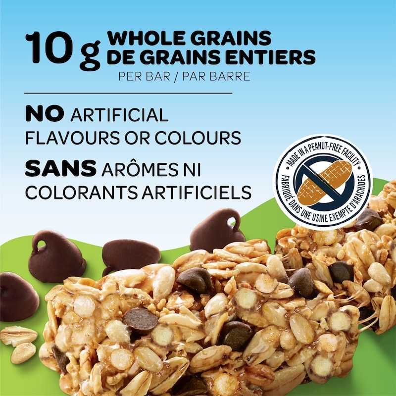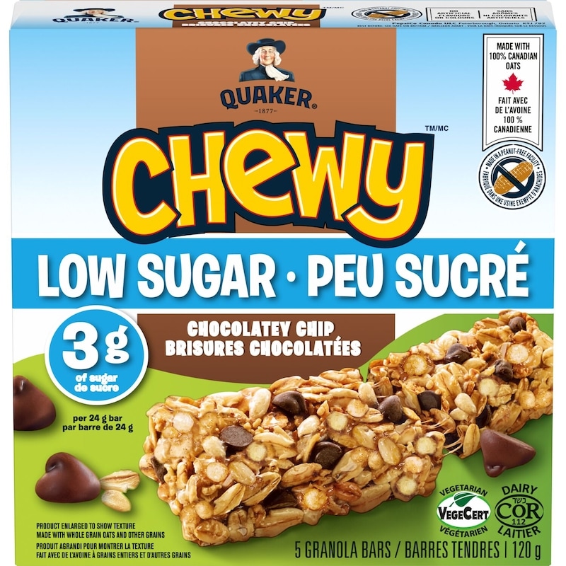 - Quaker Chewy Low Sugar Chocolatey Chip granola bars are made with the rich flavour you love in a convenient bar. These Low Sugar granola bars are made with 100% Canadian oats and other grains; made in a peanut-free facility. Keep a box in the pantry for a delicious snack you can enjoy anytime, or anywhere your day takes you. With 10 g of whole grains per 24 g serving, each bar packs a satisfying bite. This snack is a source of fibre and contains no artificial flavours or colours. Vegetarian and Kosher Dairy.