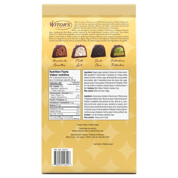 Witor's Italian Truffle is a selection of milk and dark chocolate pralines with assorted fillings: hazelnut, milk, dark and pistachio. Family size pack of 1 kg, ideal for sharing on any occasion. An irresistible mix of all-Italian flavours.