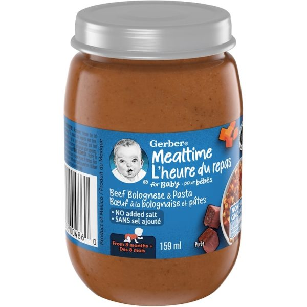 - GERBER Mealtime Beef Bolognese and Pasta is a wholesome meal made with beef and cooked pasta