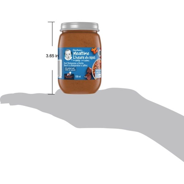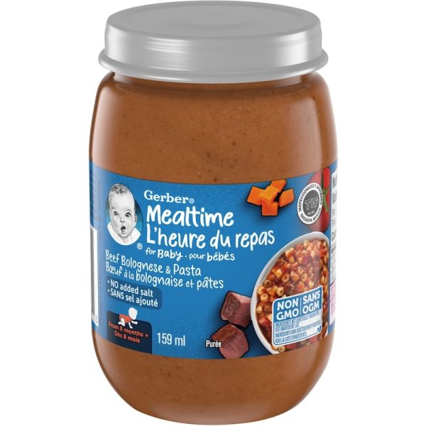 - GERBER Mealtime Purée Beef Bolognese and Pasta contains no GMOs* or added salt