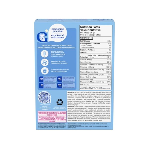GERBER Triple Goodness Raspberry Yogurt baby cereal is specially crafted for little ones 8 months and up. Designed with gut wellness in mind, this nutritious cereal helps support your baby’s growing needs as they begin their food journey.