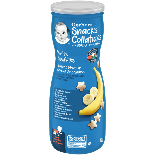 New look, same great taste! GERBER PUFFS, Banana, Baby Snacks (42 g) are made with your little one in mind. GERBER PUFFS are made with whole grains, rice, and real apple. They dissolve easily, and are a great source of iron and zinc, which help support baby’s normal growth and development. Even more, GERBER PUFFS are perfectly shaped and sized for picking up! Our star-shaped Puffs are a great first finger food snack for baby, and also help develop your baby’s fine oral and motor skills.