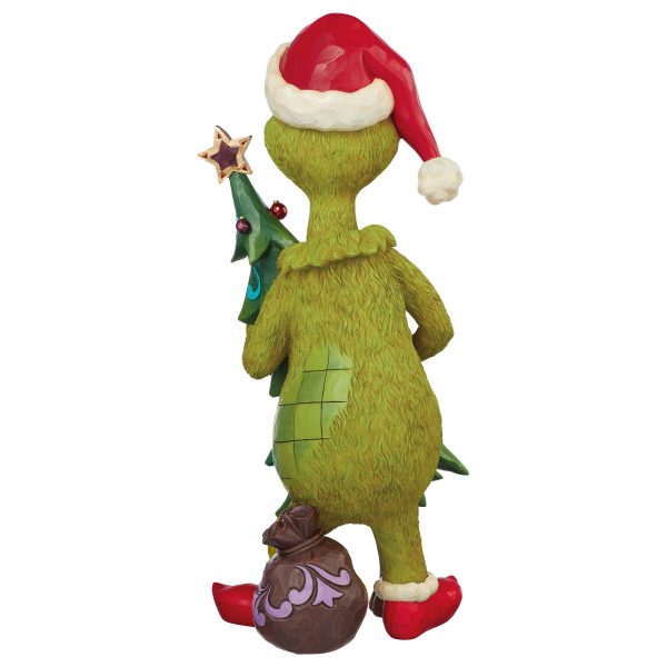 Add a touch of festive mischief to your décor with this Grinch holiday creation. Featuring the classic character in his Santa hat, tugging a decorated Christmas tree, this piece captures the humor and heart of the season. With Jim Shore’s signature craftsmanship and bold, hand-painted details, it’s a whimsical and charming addition to any holiday collection.