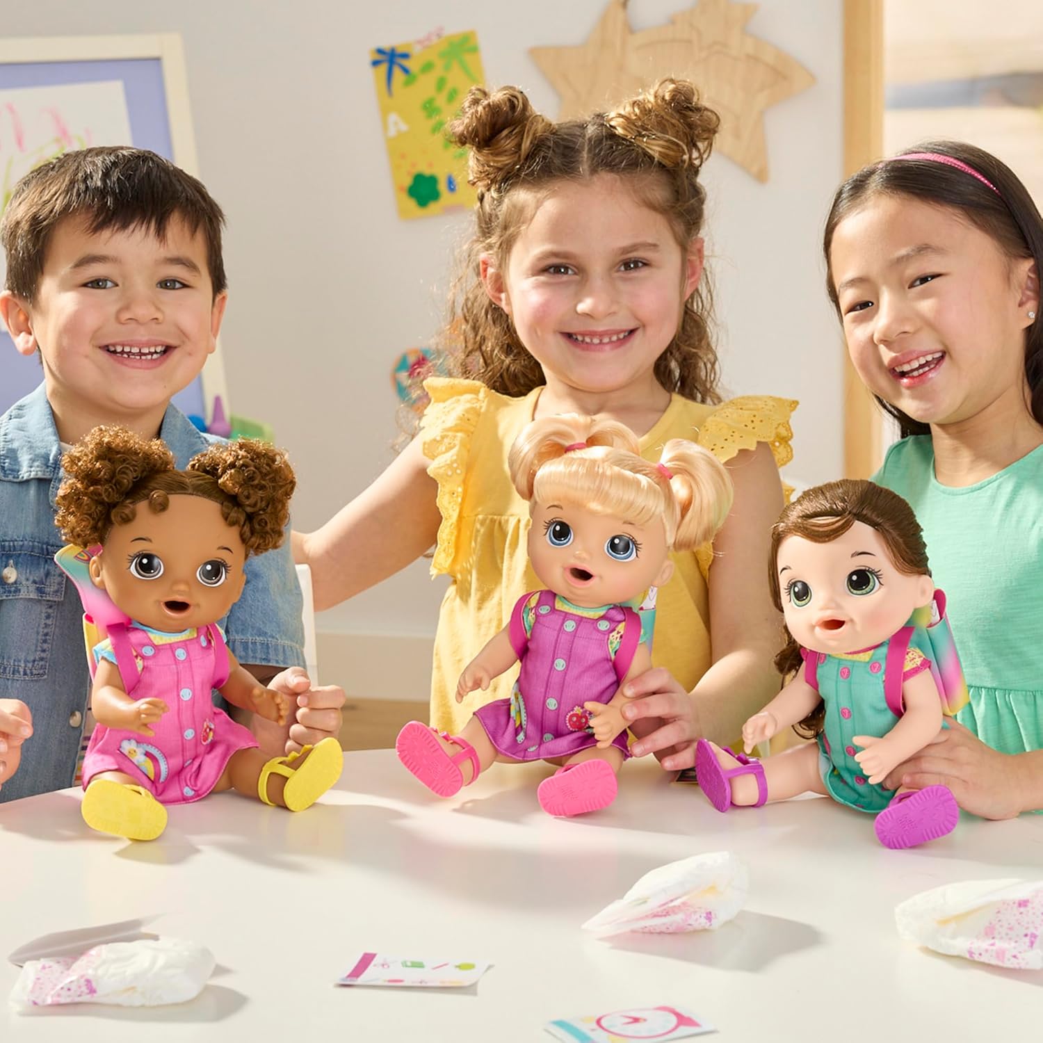 Time for School Baby is ready for school day adventures! This school-themed 12-inch baby doll for 3 year old girls and boys and up comes with Baby Alive doll accessories, like a backpack, pretend juice box, 3 worksheets, stickers and a diaper. Playing school for kids and back to school gifts are so much more fun when they have this baby doll with accessories. Baby Alive dolls & accessories make great gifts for girls and boys with big caring hearts! Baby Alive and all related properties are trademarks of Hasbro.