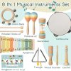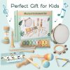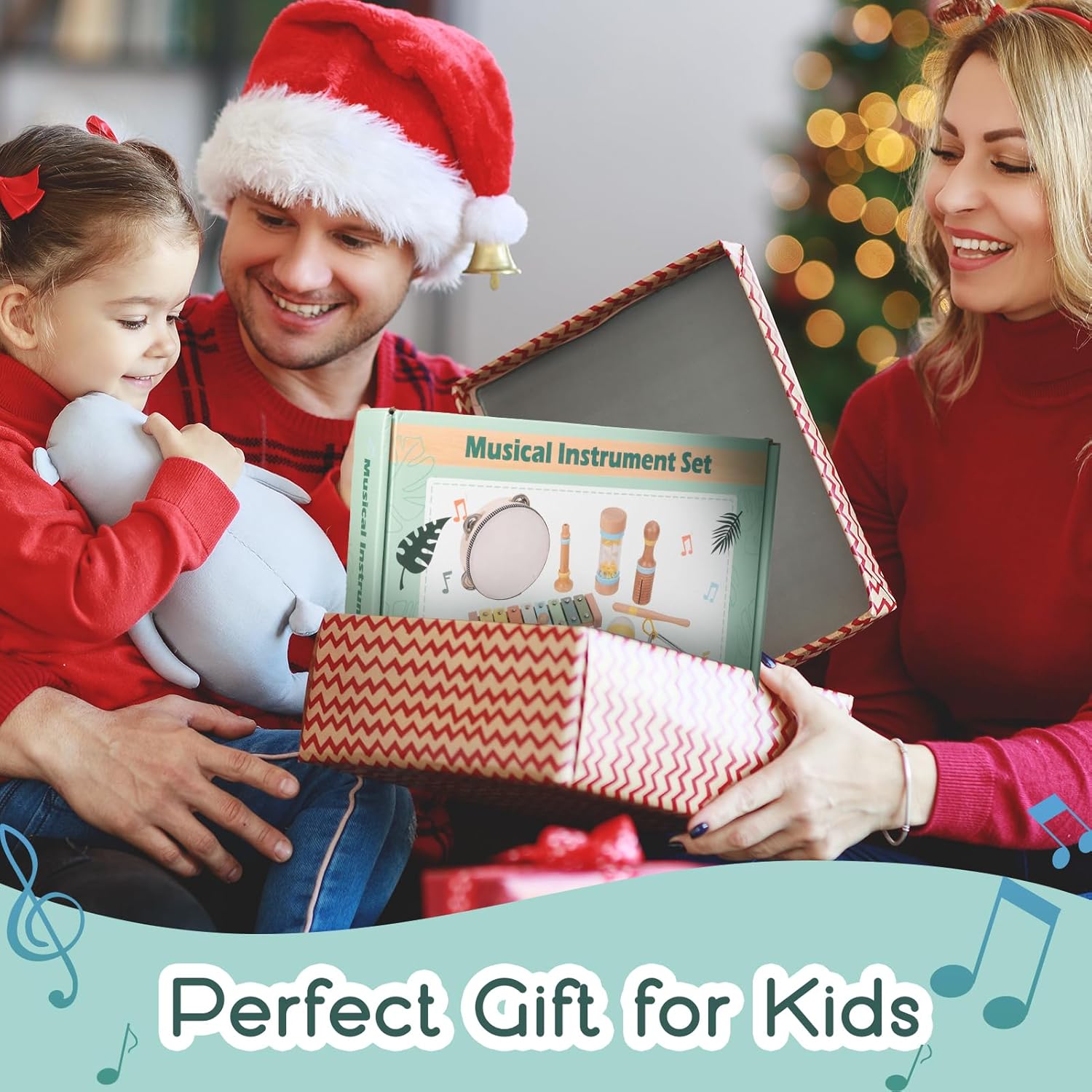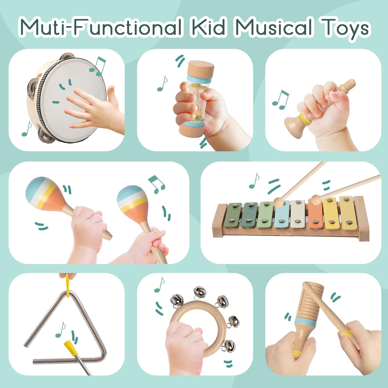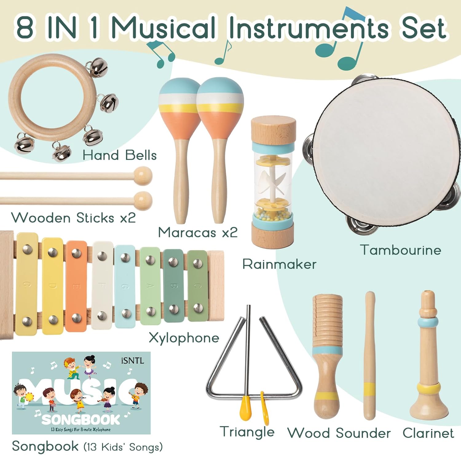 - Wooden Instruments Playset:Our toddlers musical instruments set is designed to cultivate your child's love for music! This toddler music toy set includes an early musical education songbook with 13 kids' songs, 8-tone xylophone with mallets, a tambourine with cymbals, two maracas, a trumpet, a triangle with striker, a wood sounder, a hand bells, and a rainmaker, inviting your little maestro to explore a world of sounds.This is the perfect set of musical instruments for toddlers.