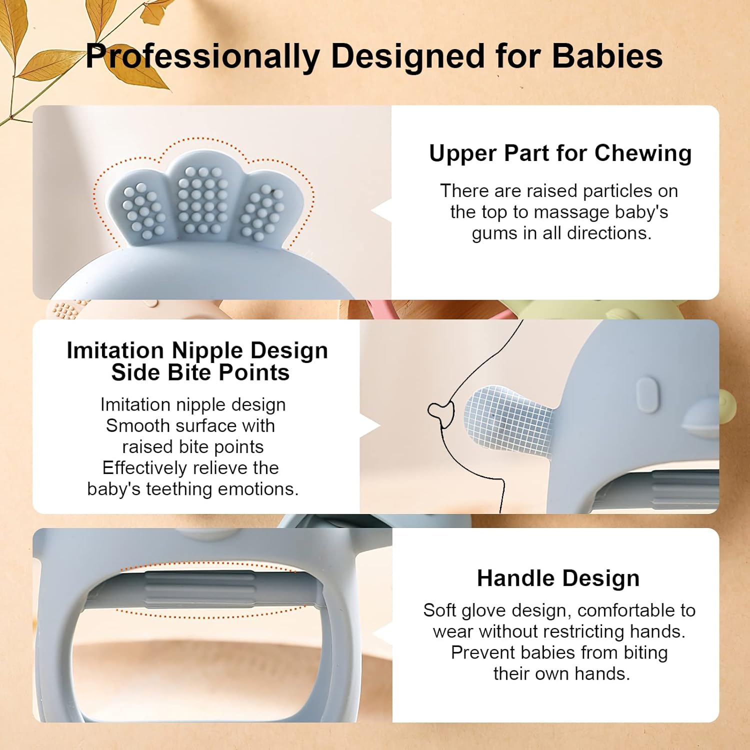 - [Relieve Baby's Teething Pain] – The teether is designed with bumpy massage particles, which can help relieve discomfort during teething and prevent the baby from sucking and chewing fingers. Protect the baby's delicate gums and promote tooth development