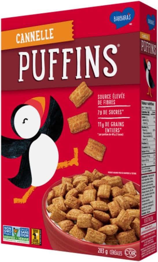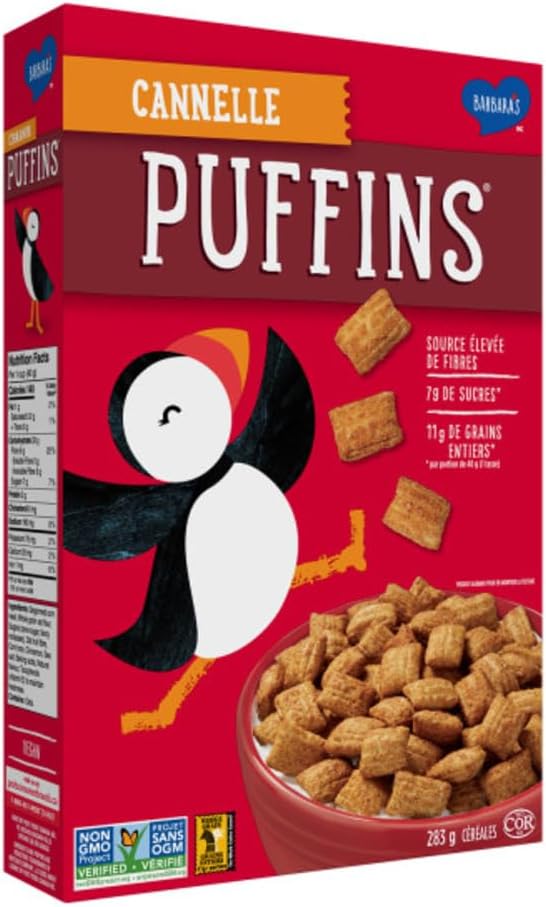 Puffins cereals are like no other—crunchy, puffy pillows with a perfect hint of sweetness. Not just delicious, but also made with goodness. We want to create a better breakfast, one puffin at a time. Cinnamon sprinkled crunchy pillows of corn and whole grain oats are a high-fibre treat and contain 5 g of sugars per 30 g serving.