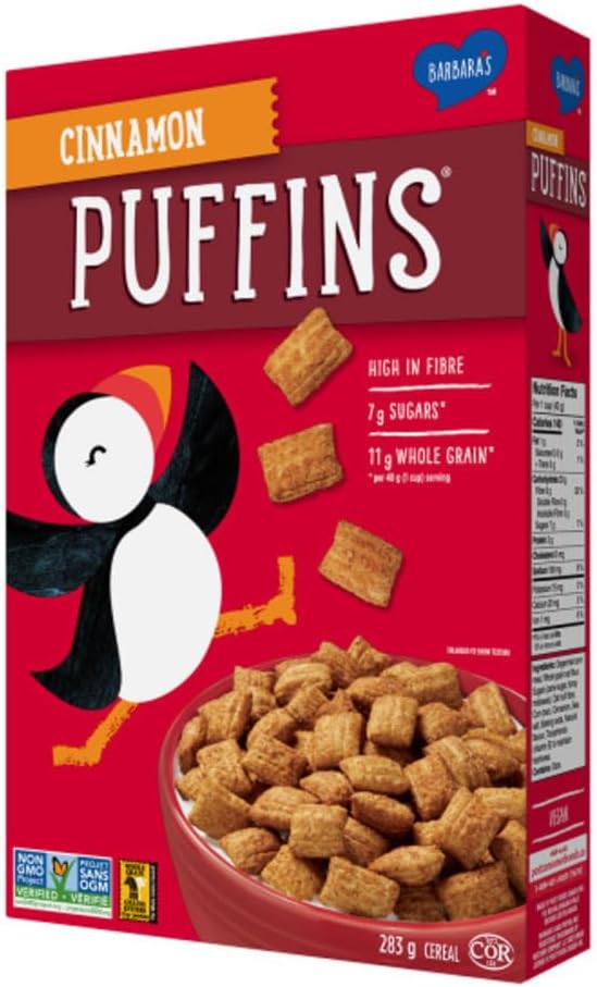 Barbara’s Cinnamon Puffins Breakfast Cereal, High in Fibre, Non-GMO Project Verified, Vegan, Kosher, Regular Size 283g