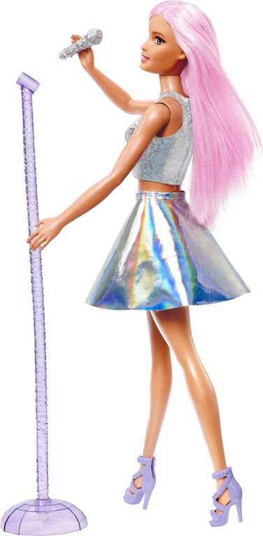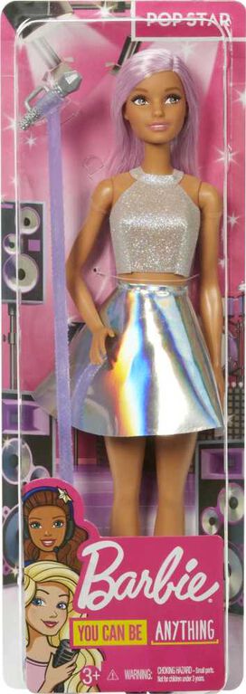 Barbie career dolls inspire kids to dream big and aim high! Each doll can achieve her goals wearing a careerthemed outfit along with accessories to play out professional moments. There are so many careers to explore. Grab the microphone and share the spotlight with Barbie pop star doll. She wears an outfit that will sparkle on stage and comes with a microphone and stand. Plus, her long pink hair hits all the right notes! Explore and collect all the Barbie career dolls and toys because when a girl plays with Barbie, she imagines everything she can become (each sold separately, subject to availability). Includes pop star doll wearing fashions and shoes, plus microphone and microphone stand. Doll cannot stand alone. Colors and decorations may vary.