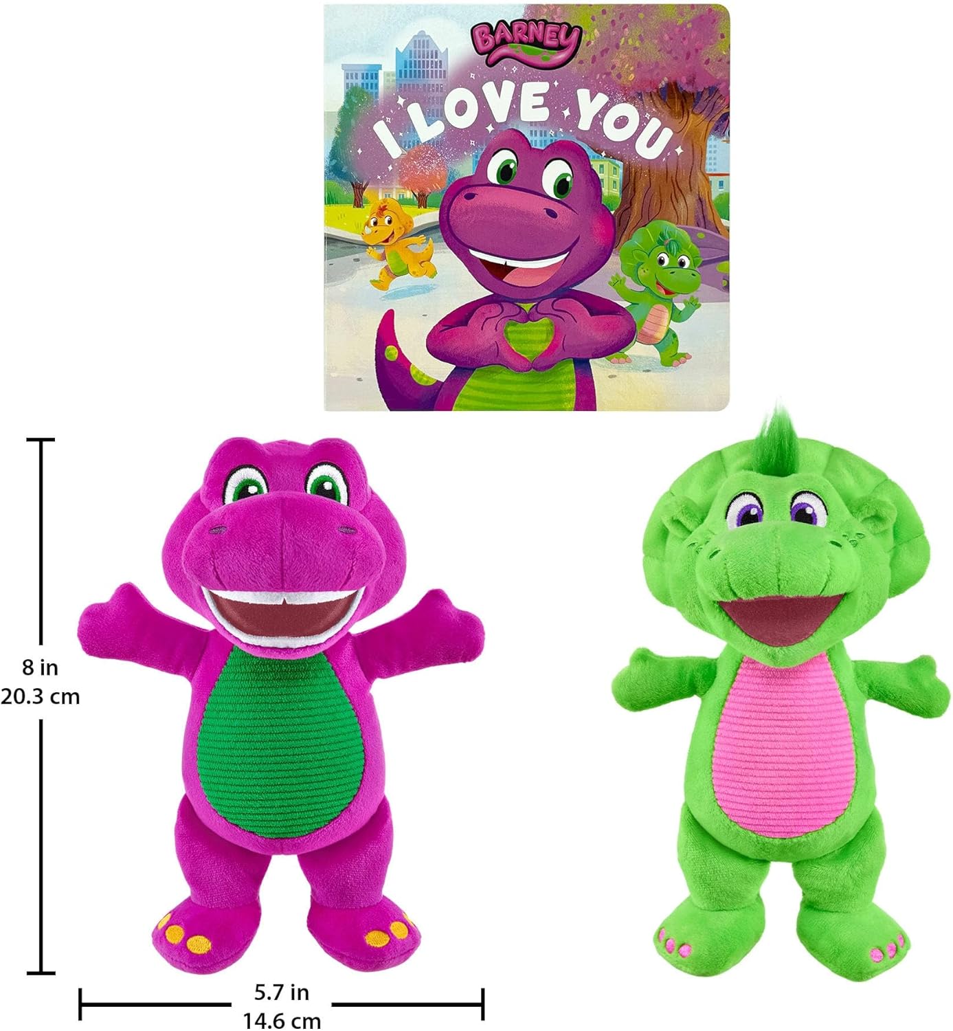 - Includes 2 plush Barney's World characters, plus a reading book!