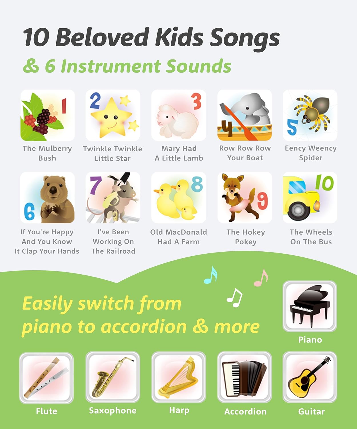 - Includes an illustrated songbook with color-coded key chart with 10 Songs & 6 Musical Instruments. Learning piano has never been so easy!
