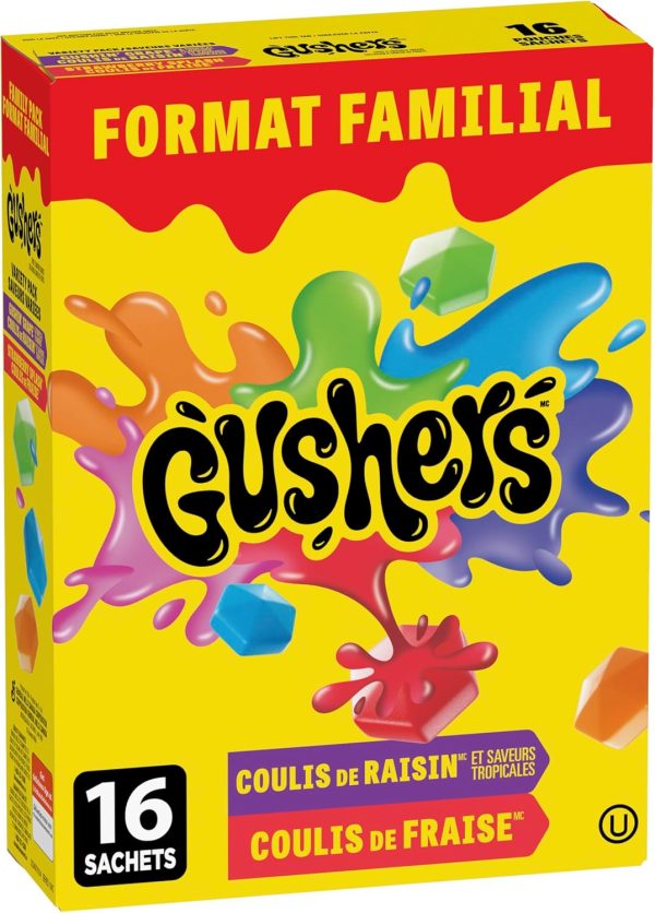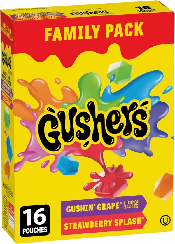 - Box contains: 1 box, 16 total pouches of grape/strawberry splash and tropical Gushers kids snacks