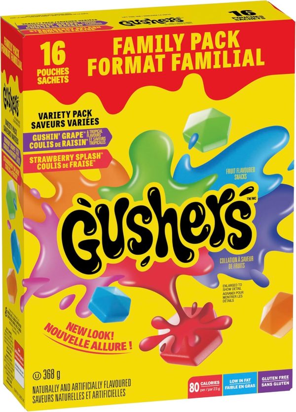 BETTY CROCKER GUSHERS – FAMILY PACK SIZE – Gushin Grape and Tropical Flavours, Strawberry Splash Fruit Flavoured Snacks, Pack of 16 Pouches, 368 Grams Package of Fruit Flavoured Snacks, Variety Flavours Pack
