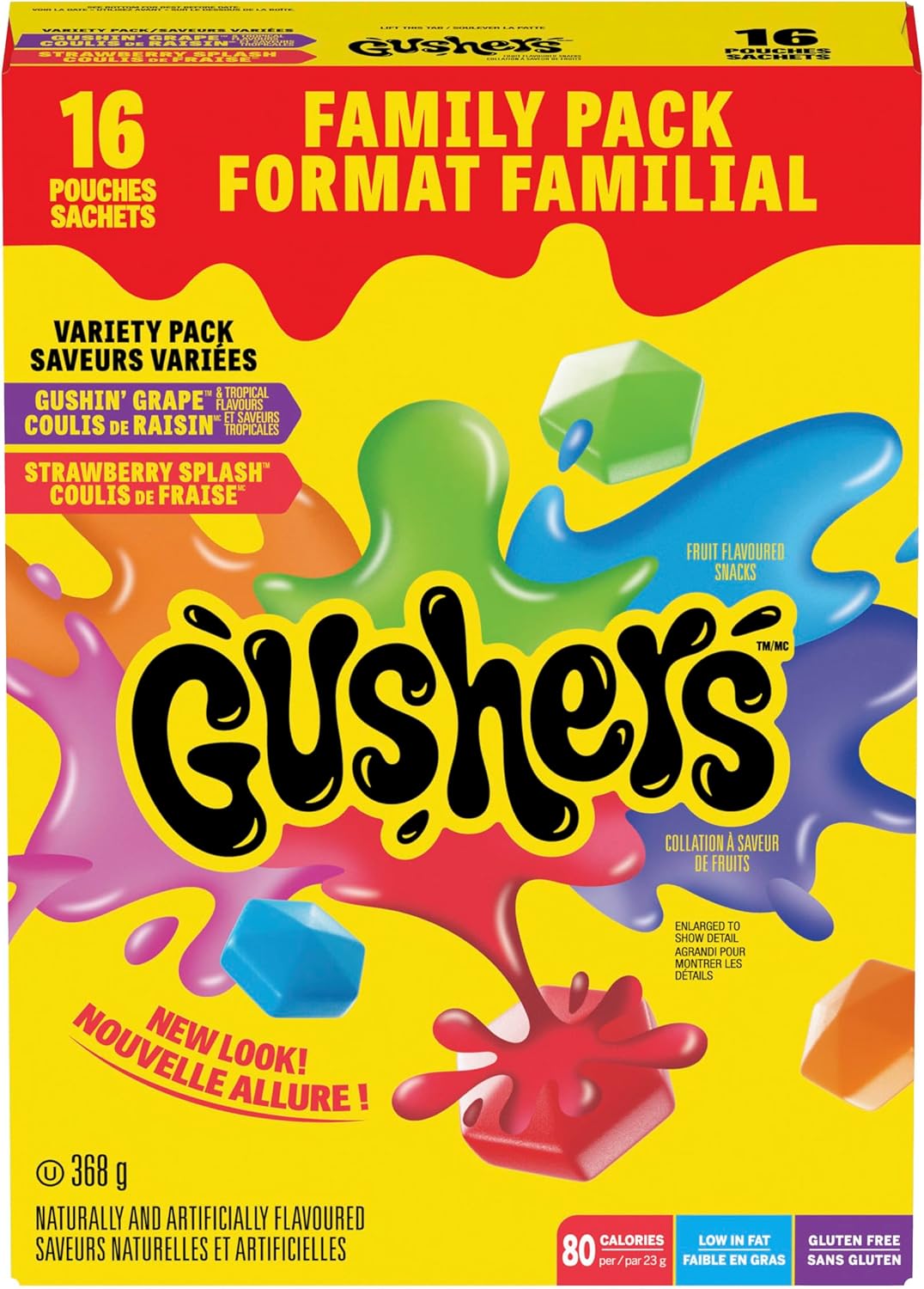 BETTY CROCKER GUSHERS – FAMILY PACK SIZE – Gushin Grape and Tropical Flavours, Strawberry Splash Fruit Flavoured Snacks, Pack of 16 Pouches, 368 Grams Package of Fruit Flavoured Snacks, Variety Flavours Pack