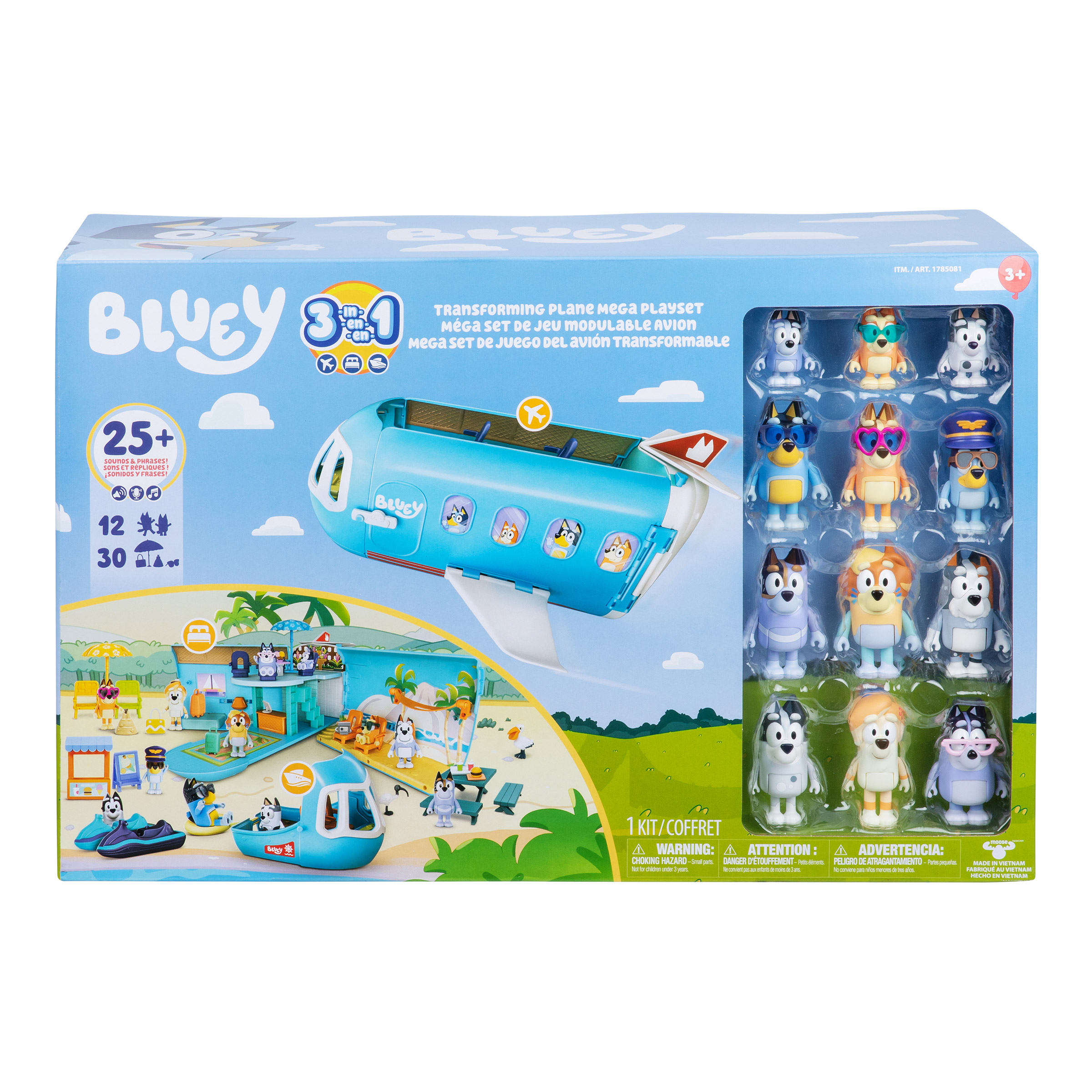 Bluey's 3-in-1 Transforming Plane Mega Playset easily transforms from a plane into a resort and a boat! Open up the body of the plane to reveal a huge 27"/ 70cm wide playset with two levels and plenty of areas to explore. The cockpit of the plane even transforms into a boat for more adventures! Includes 12 figures so you can play out the biggest Heeler vacation ever! Pilot Bluey is ready for takeoff, while Bingo, Chilli, and Bandit are all dressed for fun in the sun with their sunnies. With Grandpa Bob, Nana, Uncle Stripe, Trixie, Muffin, Socks, Uncle Rad, and Frisky all on board, the whole family is in for an unforgettable trip! The playset comes to life with 30 play pieces and over 25 sounds and phrases from the show.