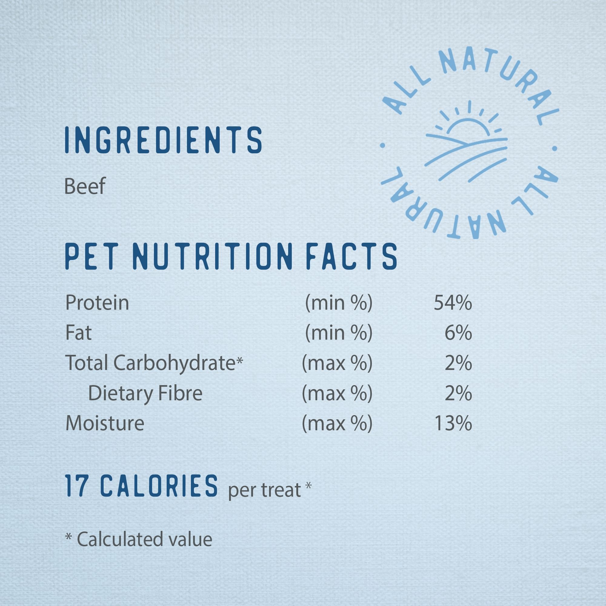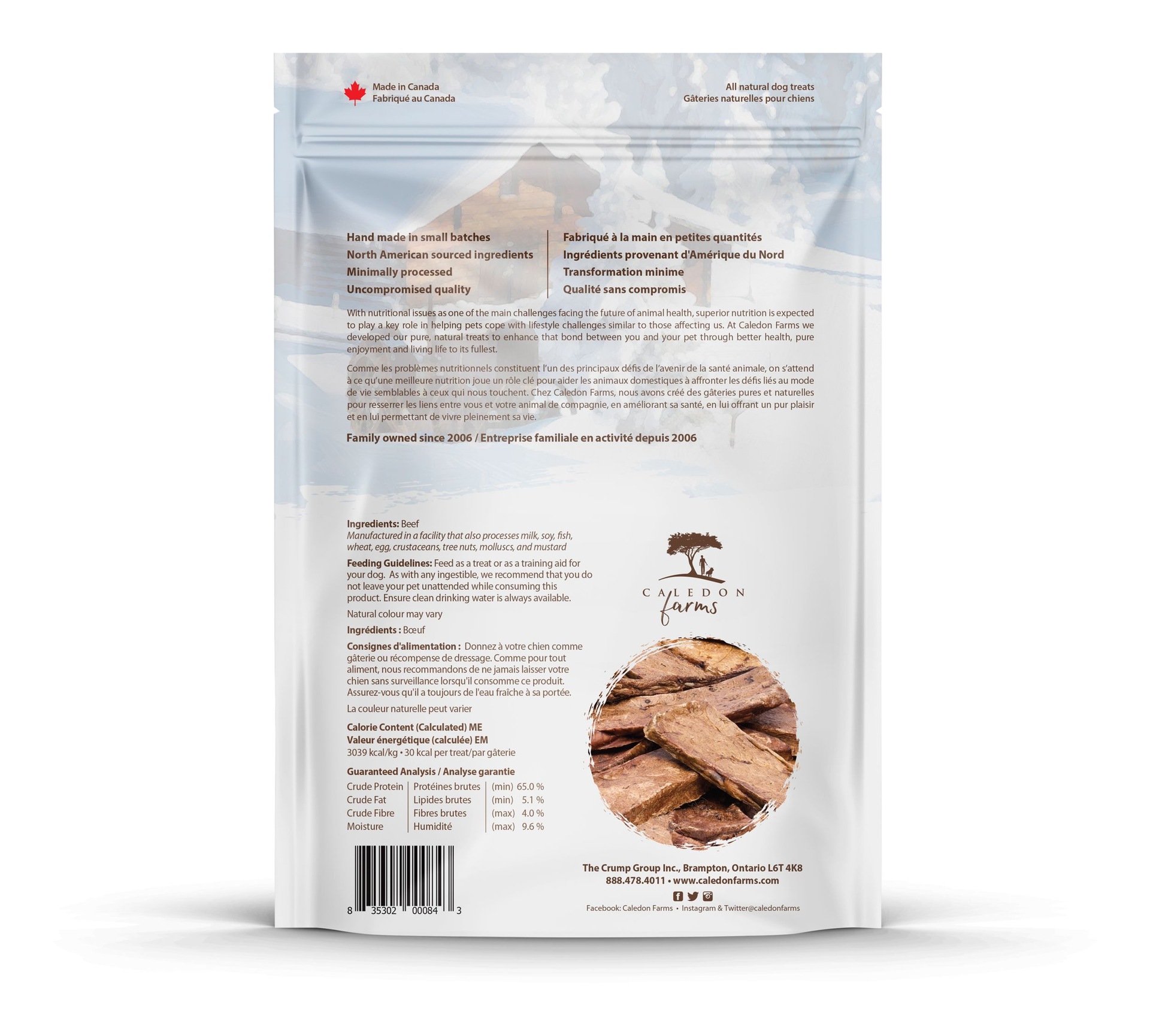 Caledon Farms Beef Tendersticks Dog Treats are the perfect treat for senior dogs and smaller breeds. Made from 100 per cent North American beef lung, these all-natural treats have a soft texture that is gentle on teeth and tummies. Slow-baked to perfection, these high-protein, low-fat treats provide essential vitamins A, B, B12, D, E and K. The quality beef lung is a source of potassium that promotes a healthy heart, nerves and muscles. A versatile and nutritious way to show your dog you care, these 110-g Tendersticks have an exceptional nutritional profile.