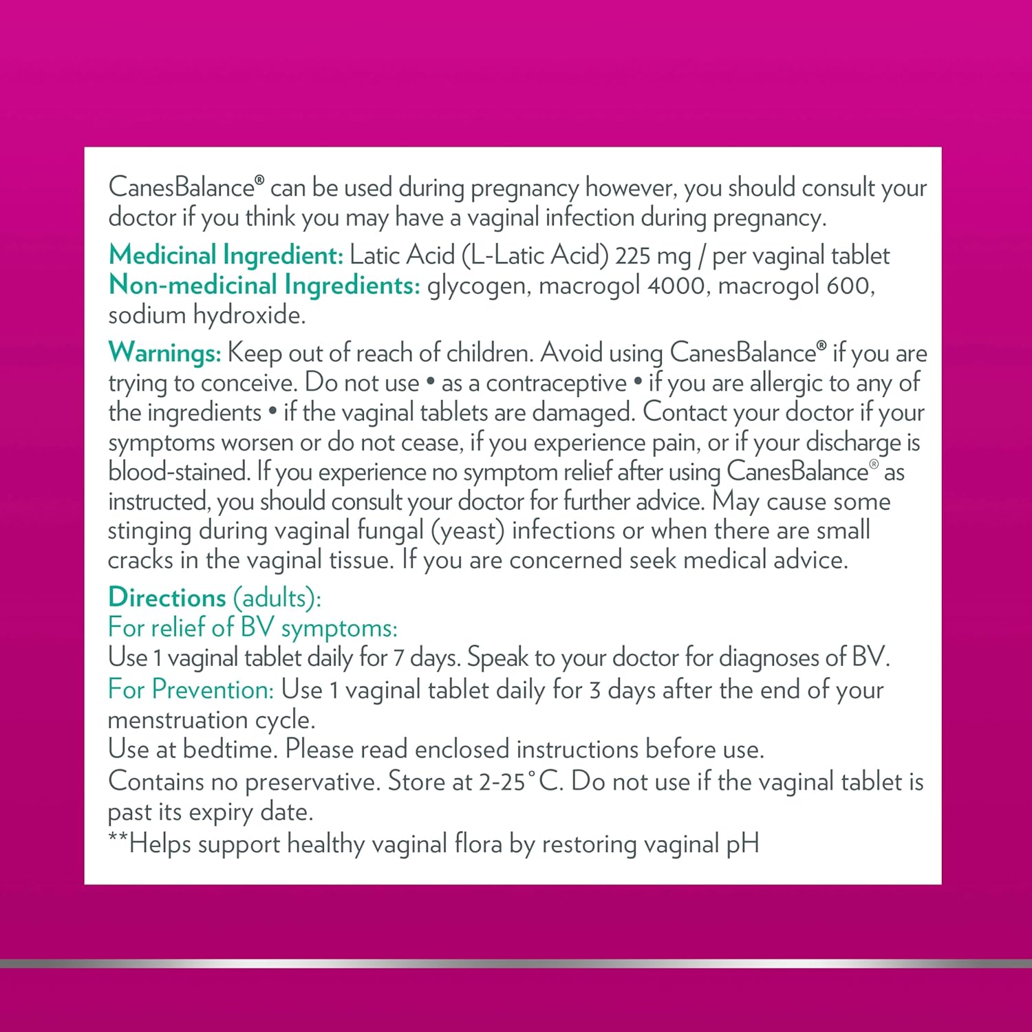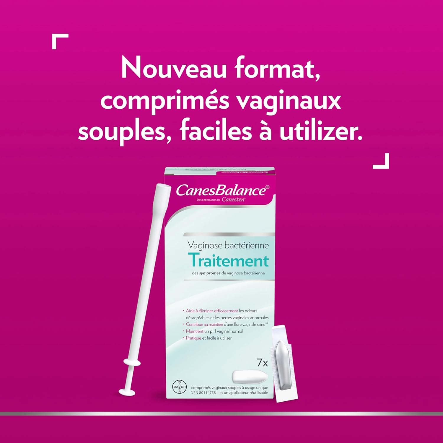 CanesBalance Bacterial Vaginosis soft vaginal tablets capsules contain a clinically proven, preservative free formula that is clinically shown to treat the symptoms of bacterial vaginosis. This BV suppository treatment for women provides a triple benefit; it relieves unpleasant odour and abnormal vaginal discharge, helps support healthy vaginal flora, and maintains normal vaginal pH. Each box contains one course of treatment with 7 easy-to-use, soft vaginal tablets and a reusable applicator for easy insertion. CanesBalance can also be used during pregnancy. As a precaution, pregnant women, or women suffering from BV for the first time, should consult their doctor for a BV test if they think they have a vaginal infection.