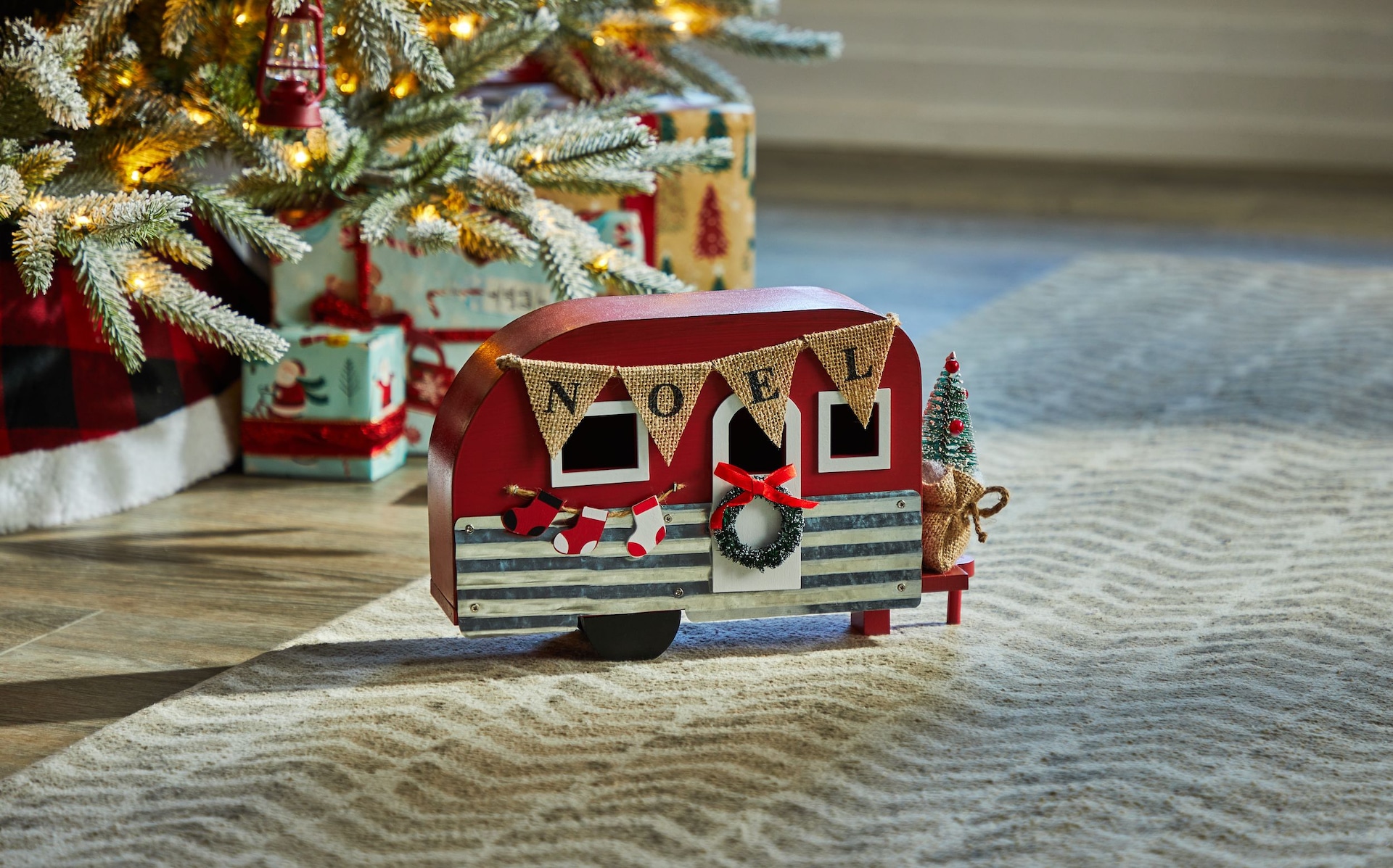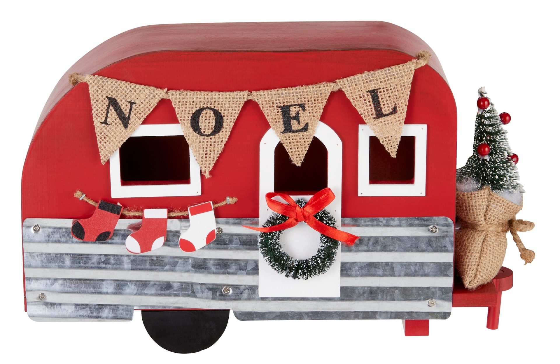 Bring the joy of the great outdoors inside with this festive CANVAS Camper Trailer tabletop decoration. Featuring an artificial tree, wreath and NOEL banner, this Christmas tabletop decoration will add a touch of vintage holiday spirit to any room. The weathered metal and canvas blend evokes memories of family road trips and camping adventures past, while the holiday details make it perfect for spreading Christmas cheer. At only 12 inches tall, it provides the perfect pop of seasonal decoration for your table or mantle without overwhelming smaller spaces. Whether you’re looking to add some rustic charm to your traditional décor or want to infuse a bit of retro nostalgia, this camper trailer is sure to provide a smile each time you see it this holiday season.