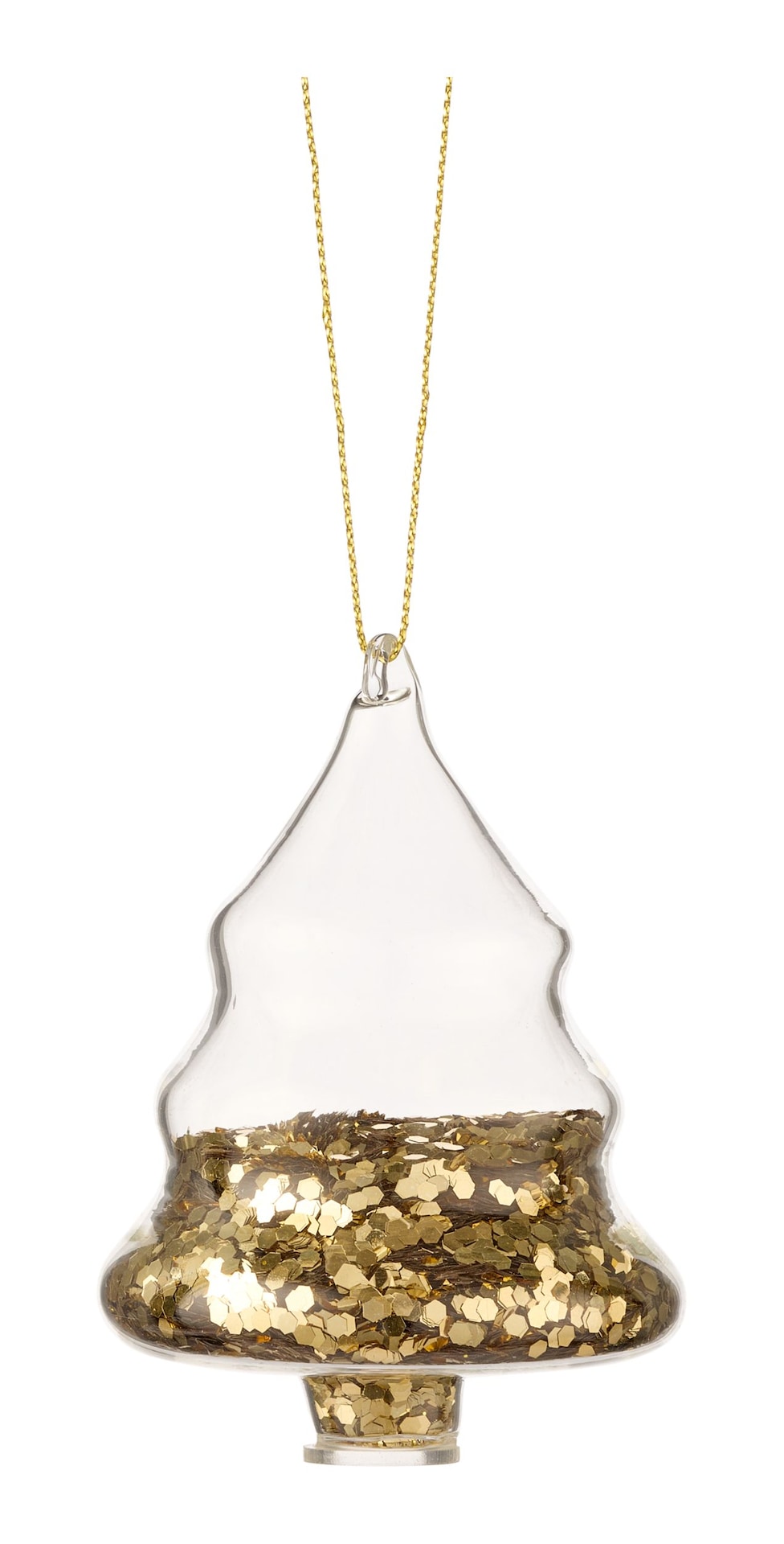 Add a touch of elegance to your holiday decor with the CANVAS Glass Tree Ornament. This exquisite ornament, filled with shimmering gold sequins, is perfect for creating a festive and luxurious atmosphere. Its sophisticated design makes it a standout addition to any Christmas tree.