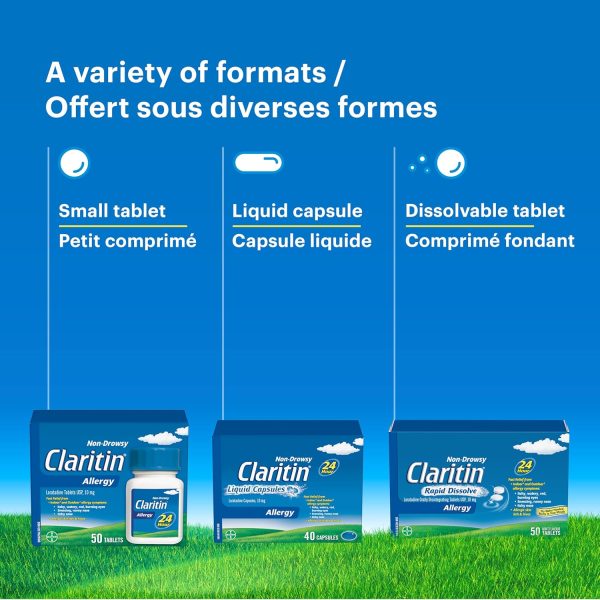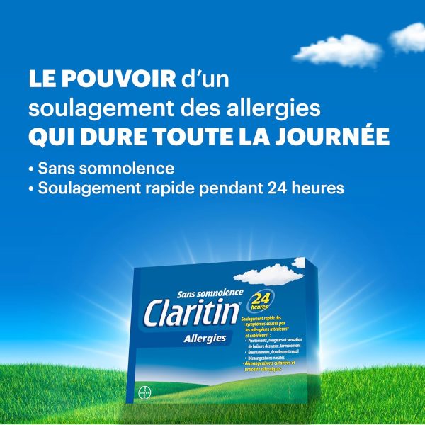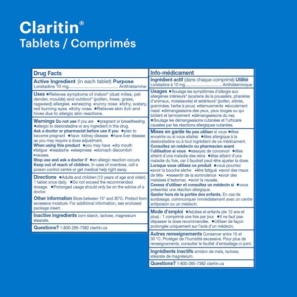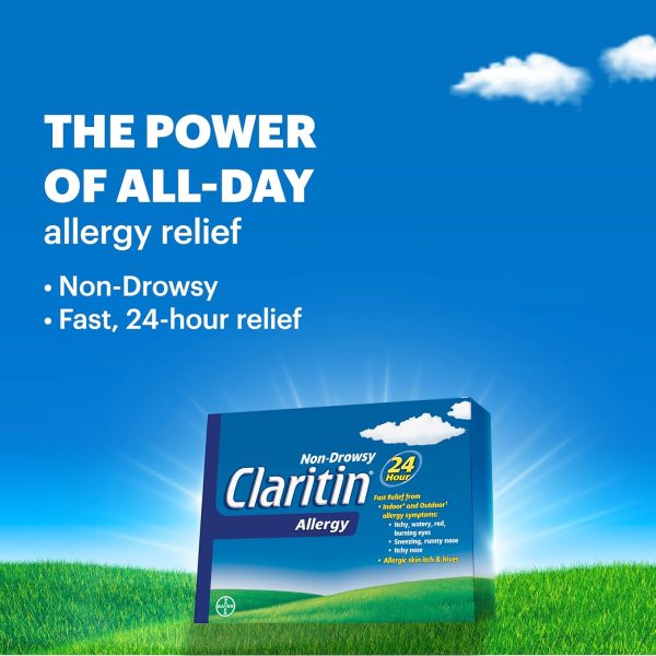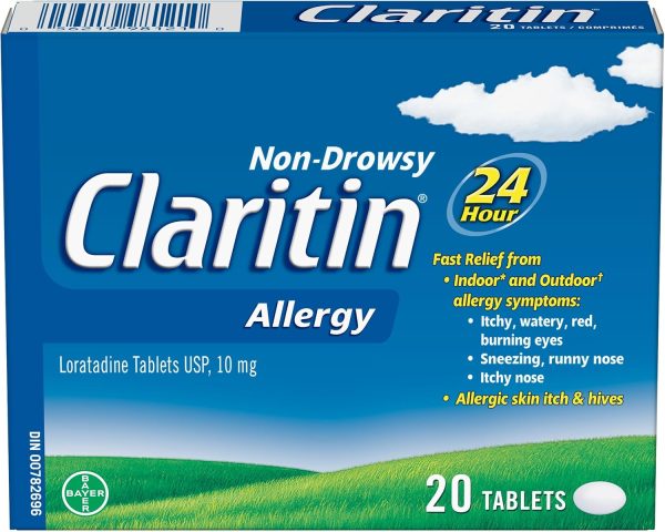 Claritin provides 24-hour Non-drowsy relief from both indoor (dust mites, animal dander, moulds) and outdoor (trees, pollen, grass, ragweed) allergy symptoms. Fast and effective relief of symptoms such as: itchy, watery, red, burning eyes; sneezing, runny nose, itchy nose, skin itch and hives. Non-drowsy formula lets you stay alert and focused throughout the day. For adults & children aged 12 yrs. and older. Each tablet contains 10 mg of loratadine.