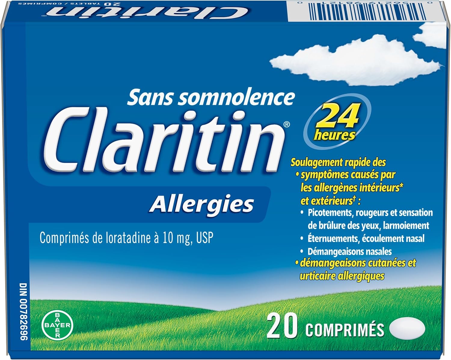 Claritin provides 24-hour Non-drowsy relief from both indoor (dust mites, animal dander, moulds) and outdoor (trees, pollen, grass, ragweed) allergy symptoms. Fast and effective relief of symptoms such as: itchy, watery, red, burning eyes; sneezing, runny nose, itchy nose, skin itch and hives. Non-drowsy formula lets you stay alert and focused throughout the day. For adults & children aged 12 yrs. and older. Each tablet contains 10 mg of loratadine.