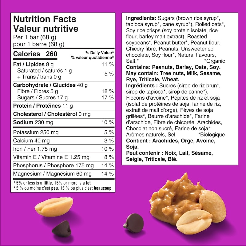 - High in protein, source of energy, and contains 70% organic ingredients. This package contains CLIF BAR Energy Bars, Chocolate Chip Peanut Crunch 680 g
