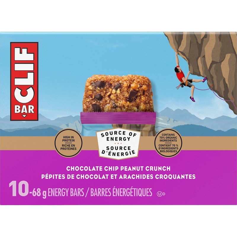CLIF BAR Energy Bars are a source of energy and protein. The delicious blend of ingredients is purposefully crafted to help keep you riding, hiking, climbing, skating, and skiing. No matter the occasion, CLIF BAR Energy Bars are the perfect snack to enjoy anytime, anywhere. Protein bars are designed to fit into a busy lifestyle, whether enjoyed as a mid-day treat or a quick snack on-the-go, CLIF BAR Energy Bars are a convenient source of energy. From school snacks to a quick bite, CLIF BAR Energy Bars are perfect for everyone in the family and made with 70% organic ingredients. CLIF BAR Energy Bars, Chocolate Chip Peanut Crunch combines a sweet taste with unique textures to create the perfect snack for everyone!