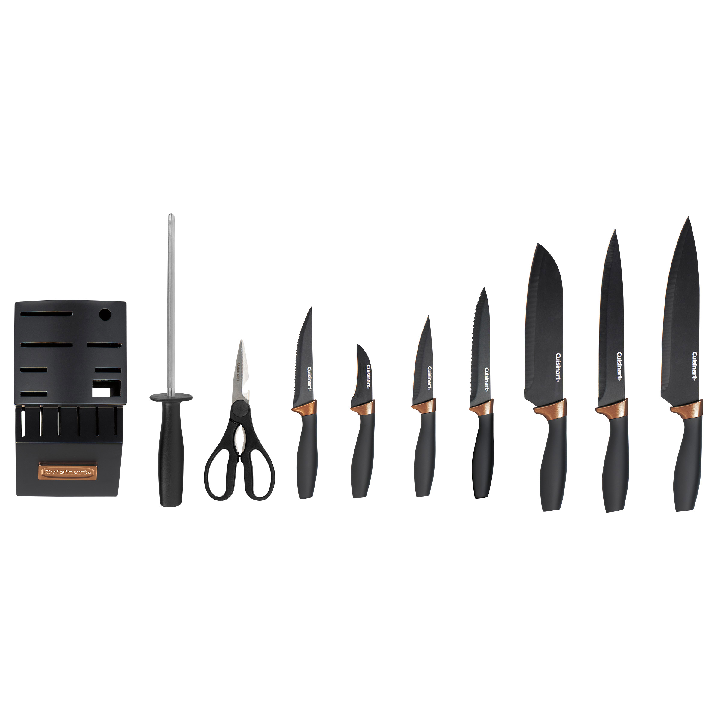 From the Metal Expressions collection. Cuisinart gathers the home cook’s essential knives and makes them available in a rubber wood block that’s ready for the countertop within easy reach! Bronze accented soft-grip handles with stainless steel make this set the perfect compliment to any kitchen.
