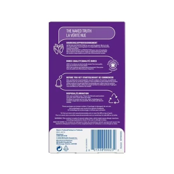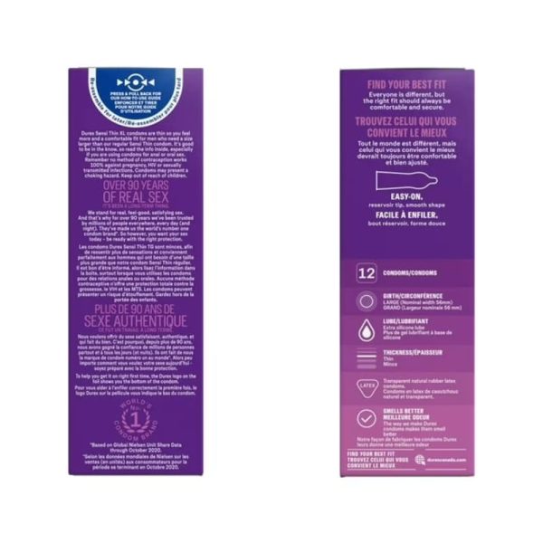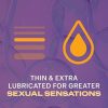 Durex Sensi-Thin Extra Lubricated Condoms are made from transparent natural rubber latex and feature an ultra-thin design. The condoms have a large 56 mm nominal width, an easy-on shape, and a reservoir tip. Each condom is pre-lubricated with silicone lubricant to help reduce friction. All condoms are electronically tested with additional quality checks. Supplied in a 12-count pack. Compatible with Durex personal lubricants. For adult use only. Follow directions on packaging.