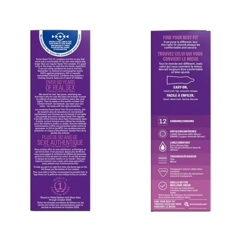 Durex Sensi-Thin Extra Lubricated Condoms are made from transparent natural rubber latex and feature an ultra-thin design. The condoms have a large 56 mm nominal width, an easy-on shape, and a reservoir tip. Each condom is pre-lubricated with silicone lubricant to help reduce friction. All condoms are electronically tested with additional quality checks. Supplied in a 12-count pack. Compatible with Durex personal lubricants. For adult use only. Follow directions on packaging.