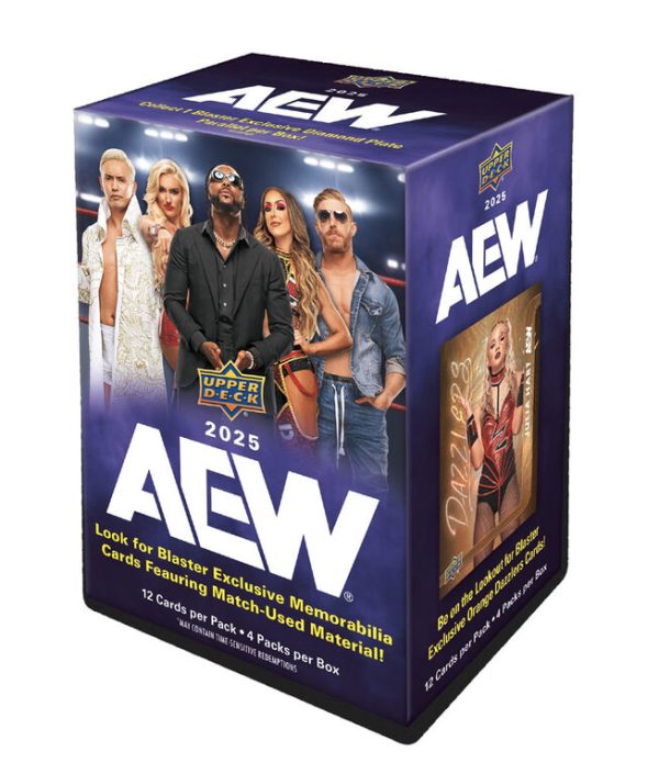 The 2025 AEW edition includes a 100-card base set with four subsets – Wrestlers, First UD, Tag Teams/Trios and Crew. NEW Content! The 2025 edition features some intriguing new content: Finish It features some of AEW’s best and most notable finishing moves like Toni Storm’s “Storm Zero” and Mariah May’s “Mayday.” Each card will feature the finishing moves for two wrestlers on a unique lenticular substrate. Neon Monikers feature a prominent and colorful design and some of the most noteworthy nicknames in AEW. Look for the BlasteUnique Red parallel.