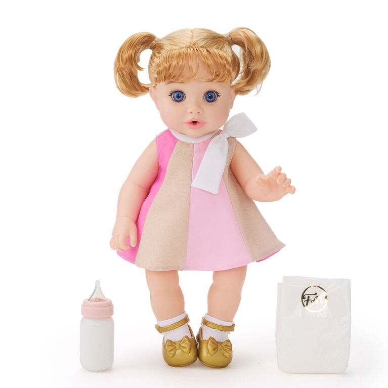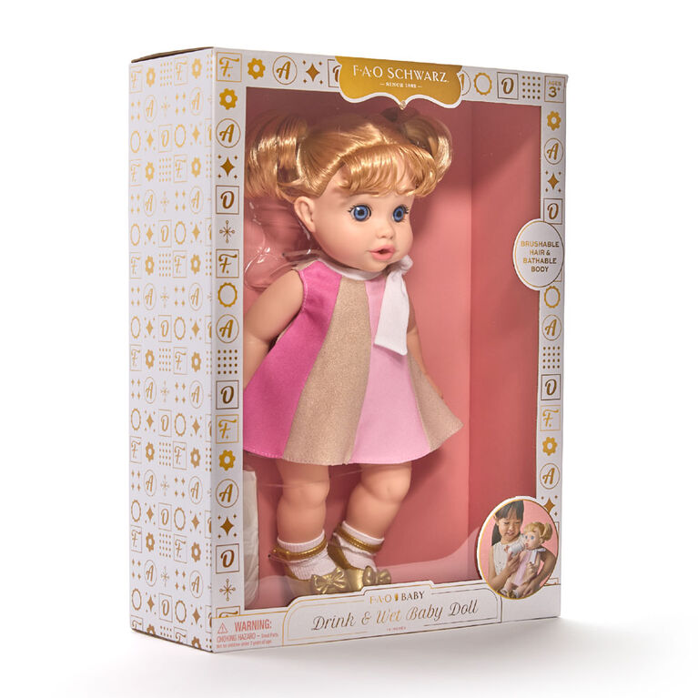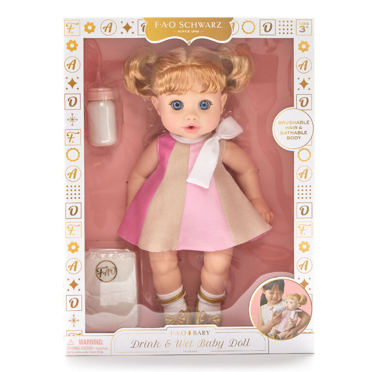 Unique, only available at our store. The F.A.O. Schwarz Drink & Wet Baby Doll brings a new level of interaction to doll play. Perfect for toddlers 18 months and older, this 35cm doll boasts lifelike detailing, including realistic, brushable hair and a bathable body. Teach your child nurturing skills by feeding the doll with its own bottle, then watch as they learn about caregiving through changing the doll’s wet diapers. Outfitted in a cute dress with diaper cover, socks, and shoes, this set also includes an extra diaper and a birth certificate for naming and personalizing the doll. This engaging toy not only entertains but also encourages nurturing play and helps develop responsibility in young children, making it a valuable addition to their toy collection.